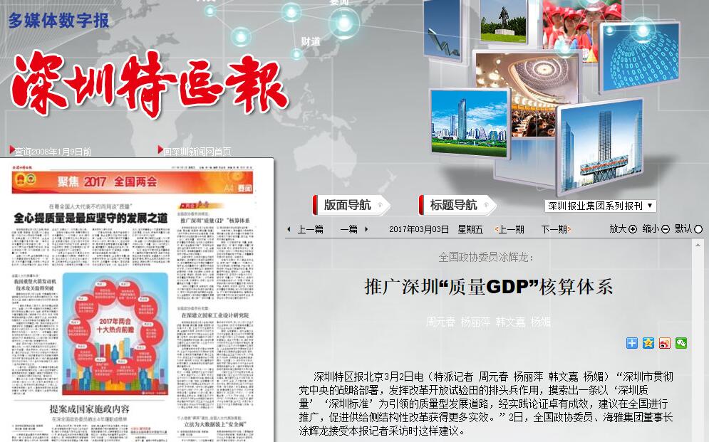 “深圳市贯彻党中央的战略部署,发挥改革开放试验田的排头兵作用,摸索出一条以‘深圳质量’‘深圳标准’为引领的质量型发展道路,经实践论证卓有成效,建议在全国进行推广,促进供给侧结构性改革获得更多实效。”2日,全国政协委员、海雅集团董事长涂辉龙接受记者采访时这样建议。
